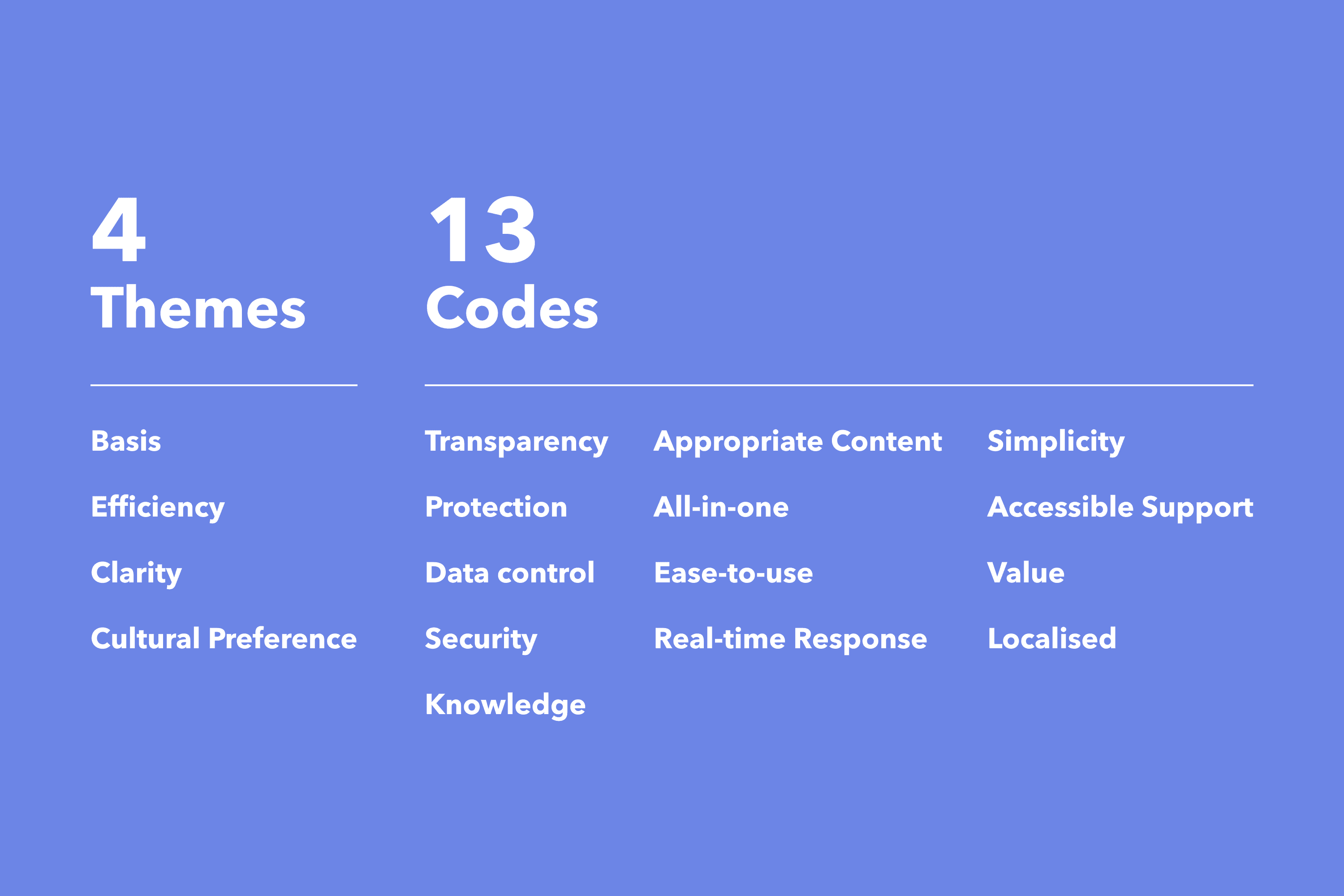 The left framework visualises my systematic interview analysis: 13 codes organised across four themes (Basis, Efficiency, Clarity, Cultural Preference). Transparency emerged as the highest-priority code, mentioned 17 times across all participants, followed by protection (14) and data control (13). The right chart shows code frequency distribution, revealing that whilst European interviewees used autonomy-focused language ("I control my data"), Asian participants emphasised systemic reliability ("the organisation protects me"). This dual-layer analysis—thematic organisation plus frequency mapping—established evidence-based design requirements, ensuring prototypes addressed genuine cognitive differences rather than cultural assumptions.