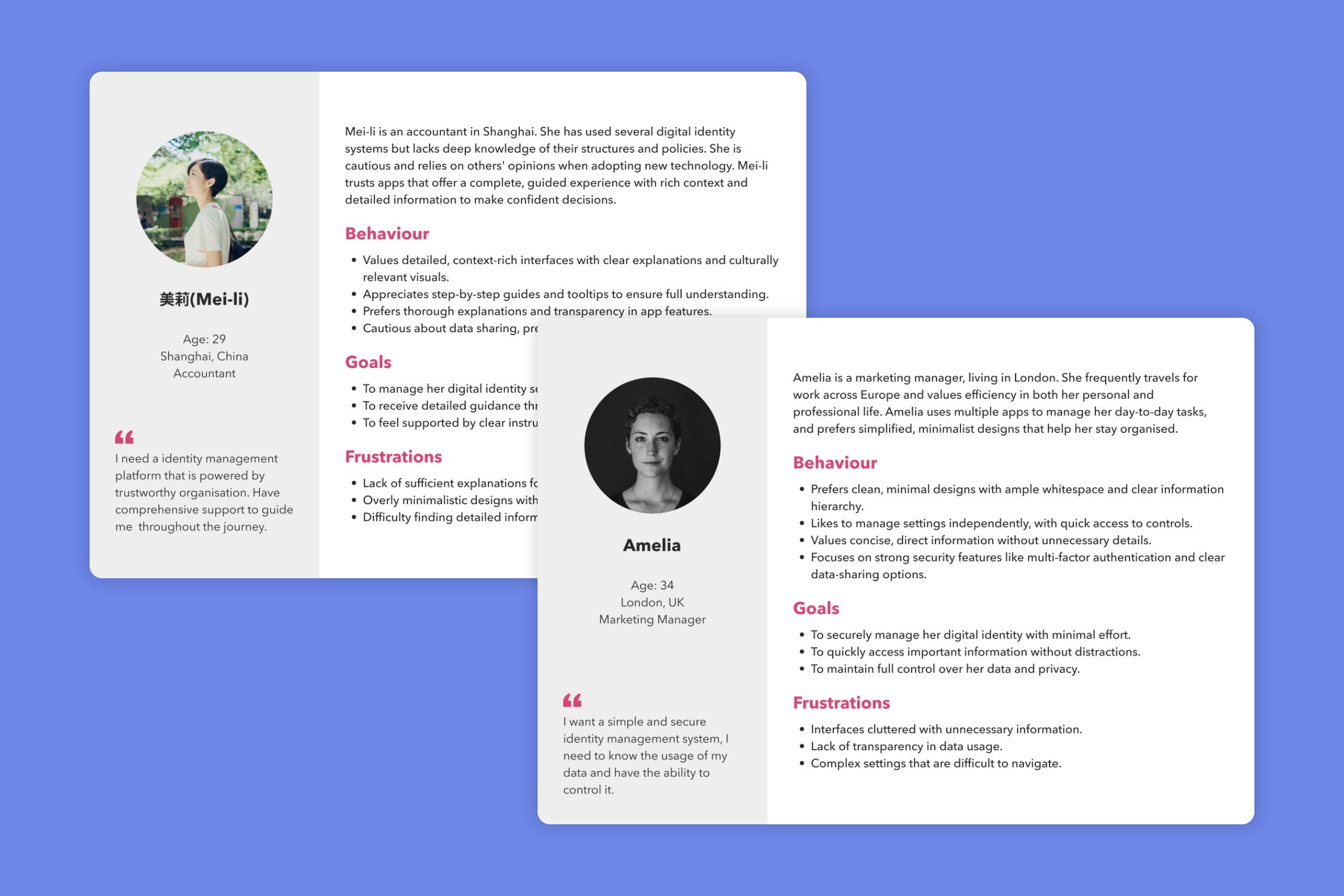 The left framework distills survey and interview findings into divergent trust models: European users prioritise individual data control, clear communication, and strong security measures—reflecting analytic cognition focused on autonomous decision-making. Asian users emphasise overall system trustworthiness, comprehensive support, and security within trusted frameworks—reflecting holistic thinking valuing institutional reliability. The right personas translate these frameworks into concrete archetypes: Amelia (London) embodies European preferences for transparent control and minimal interfaces; Mei-li (Shanghai) represents Asian needs for comprehensive guidance from trusted organisations. This systematic research-to-design translation ensures prototypes address cognitive differences, not cultural stereotypes.
