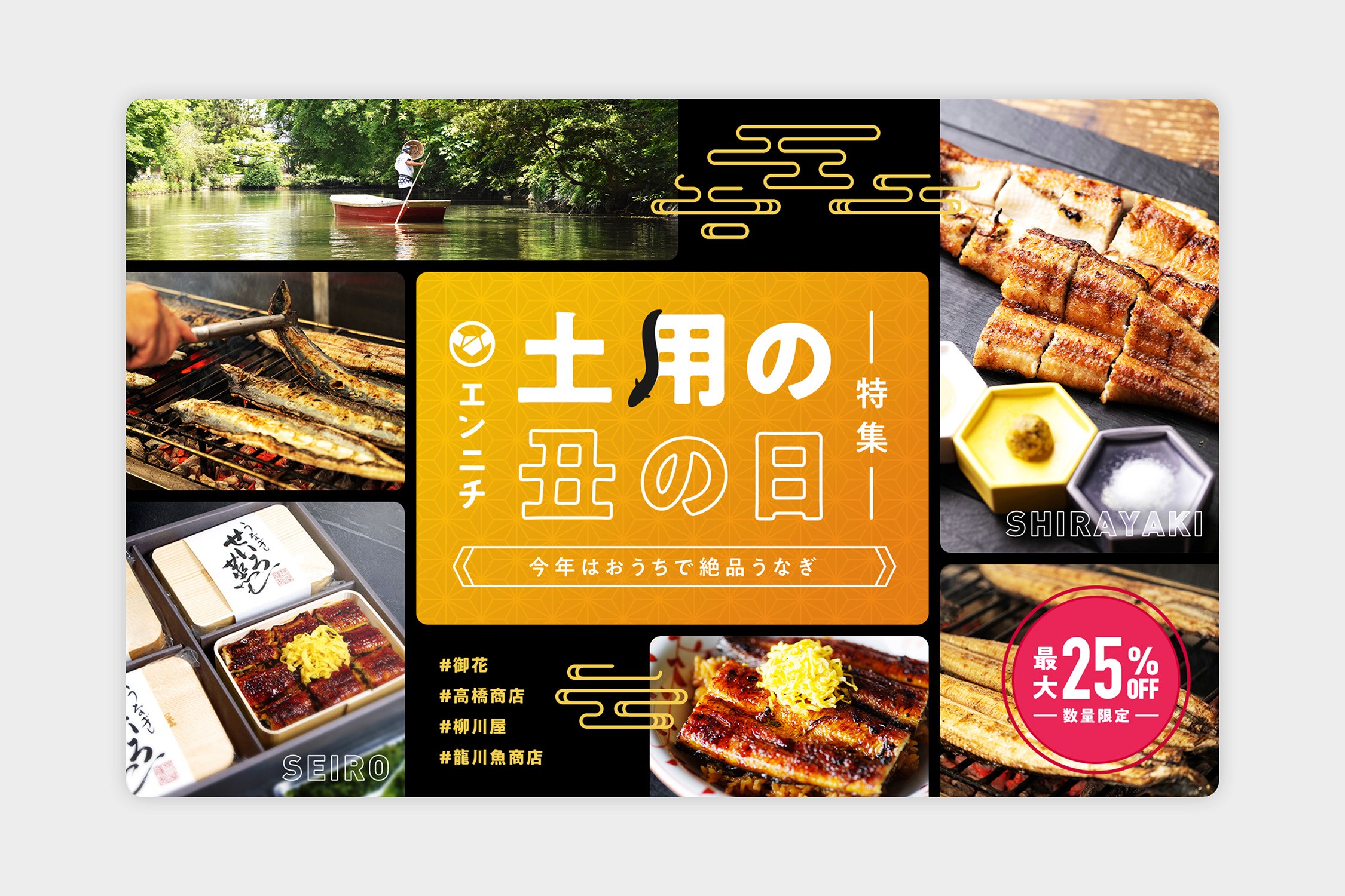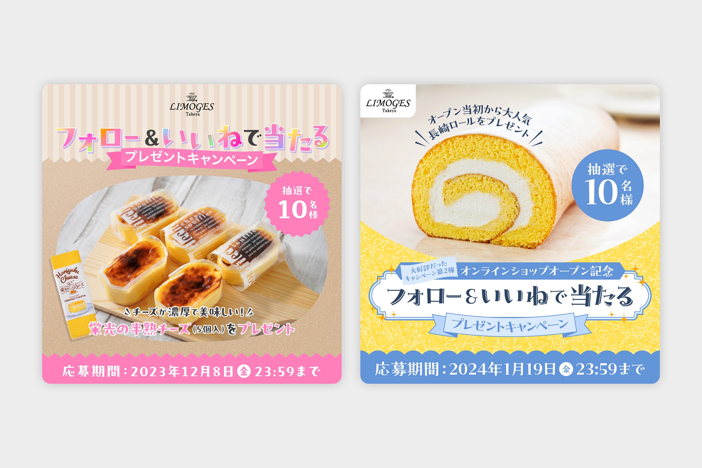 Each design demonstrates strategic visual differentiation based on target audience and product positioning. The "Doyo no Ushi no Hi" campaign on the left employs traditional Japanese visual language—combining product photography with evocative local scenery to emphasise regional authenticity and craftsmanship. In contrast, the cake shop campaigns on the right adopt a soft, playful aesthetic with pastel colours and carefully arranged typography to resonate with the core demographic of women in their twenties and beyond. All logo designs and typographic treatments are crafted through thoughtful typeface selection, spacing refinement, and visual effects to ensure each brand maintains distinct personality whilst achieving immediate visual appeal.