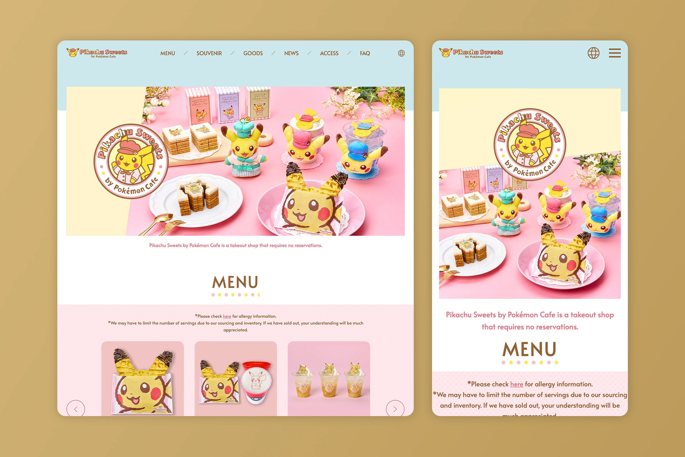 The responsive layouts on the left demonstrate a mobile-first approach—optimising navigation and content hierarchy for both dedicated fans and general visitors across device sizes. The Pokémon Sweets landing page on the right showcases the visual direction that balances playful character appeal with dining establishment sophistication, using soft colour palettes and clear information architecture to create an inviting digital experience that complements the café's offering.